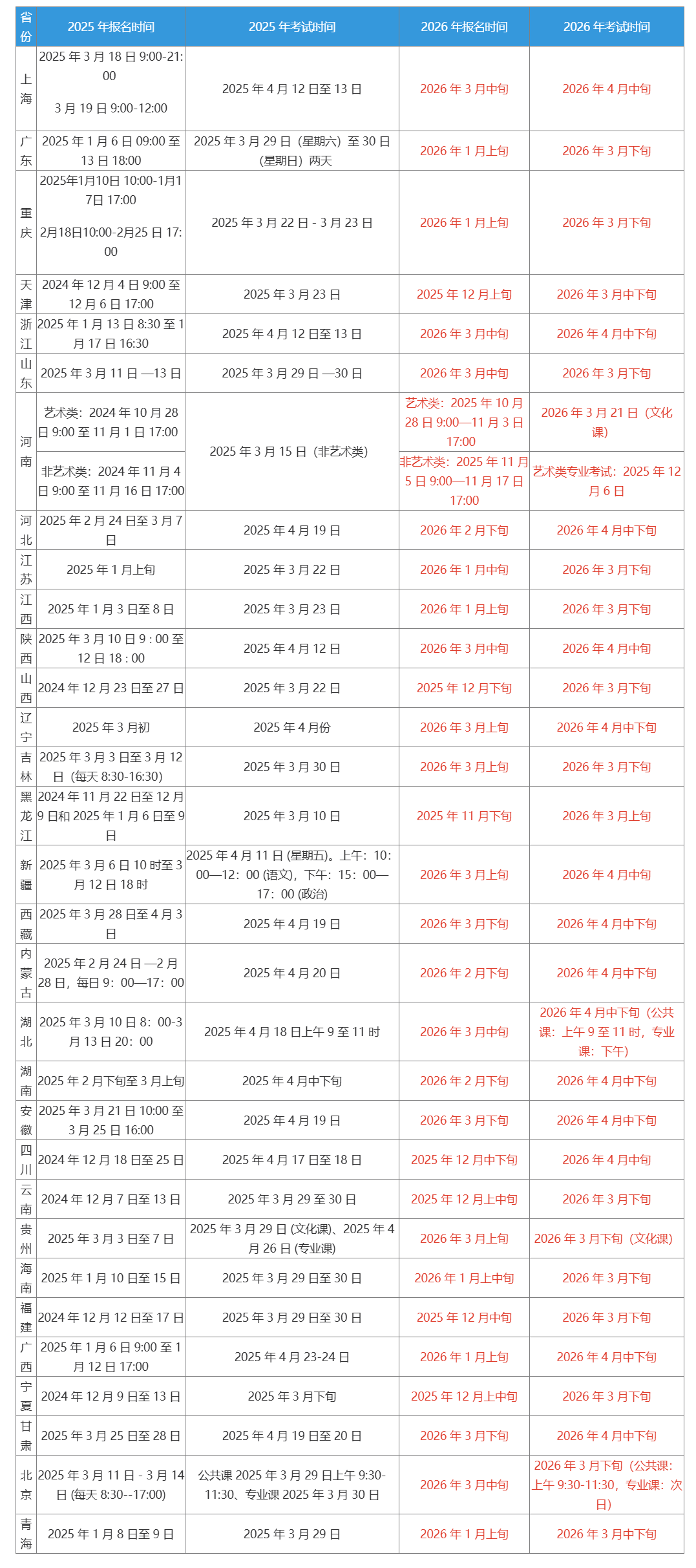 2026年全国各省统招专升本报名时间与考试时间大全:预计一些专升本大省当中诸如山东2026年升本报名时间为2026年3月中旬左右,考试时间2026年3月底;湖北2026年升本报名时间3月下旬,考试时间公共课:4月下旬上午9至11时,专业课:4月下旬下午。