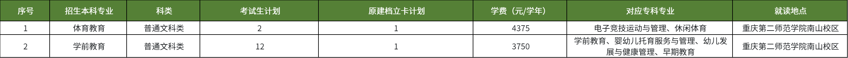1.涉及专业:共2个普通文科类专业(体育教育、学前教育),均在重庆第二师范学院南山校区就读。