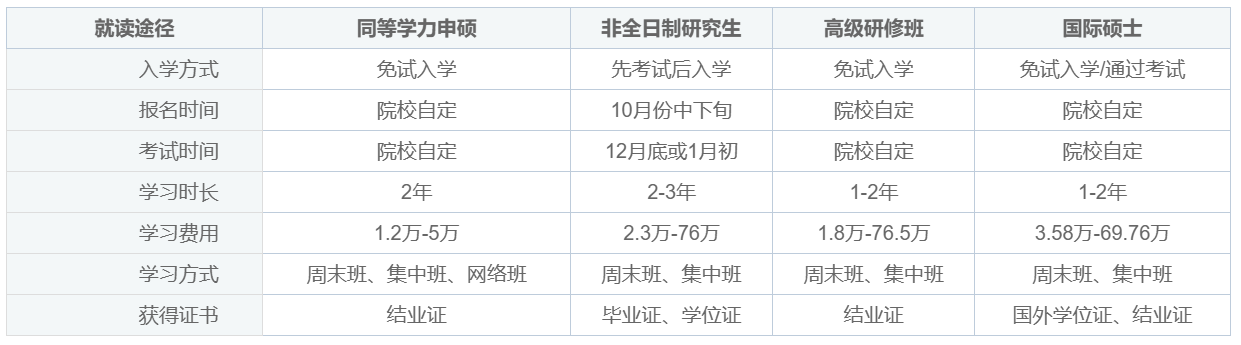 大专学历报考在职研究生四种类型对比: